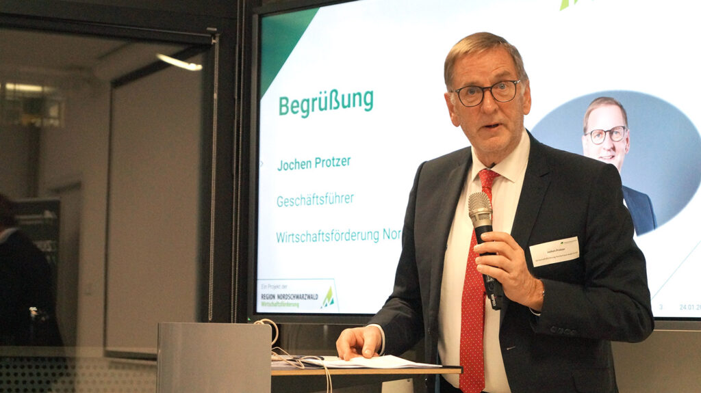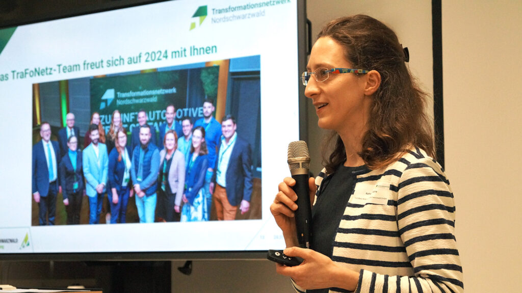 Nach einer kurzen Begrüßung durch Jochen Protzer, Geschäftsführer der Wirtschaftsförderung Nordschwarzwald, stimmt TraFoNetz-Projektleiterin Katharina Bilaine den Kreis der Zuhörenden auf die Themen der Abendveranstaltung und auf die Ziele des Kompetenzzentrums für Transformation ein. Es gehe darum, so Bilaine weiter, Innovationen zu fördern und Netzwerke zu etablieren, außerdem Transformationsstrategien zu fördern sowie die Weiterbildung voranzubringen und das Angebot an Fachkräften zu sichern. In der folgenden Moderation wechselt sie sich mit Julia Dobler ab, Ingenieurin und Gründerin der Agentur „Flottenagentin“ in Markgröningen, nahe Ludwigsburg.