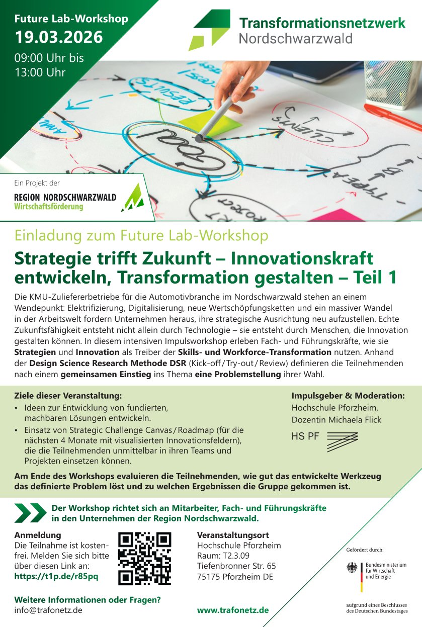 Future Lab-Workshop: Strategie trifft Zukunft – Innovationskraft entwickeln, Transformation gestalten – Teil 1 + Zu Google Kalender hinzufügen + iCal / Outlook exportieren Datum 21. Mai 2026 Uhrzeit 09:00 - 13:00 Weitere Informationen Anmeldung Standort Hochschule Pforzheim Raum: T2.3.09 Tiefenbronner Str. 65 75175 Pforzheim DE Anmeldung Teile diese Veranstaltung SuchenSuchen Categories Neuigkeiten TraFoNetz Recent Posts Wirtschaftsministerin empfängt Delegation aus dem Nordschwarzwald im Haus des Landtags Entscheidungsjahr 2025: Die Stunde der Transformation im Nordschwarzwald Impulse für die Zukunft: Transformationskongress macht Mut zur Veränderung Resolution zur Rettung der kleinen und mittleren Unternehmen im Nordschwarzwald Schlüssel zur Fachkräftesicherung – TraFoNetz-Workshop zu generationenübergreifender Zusammenarbeit