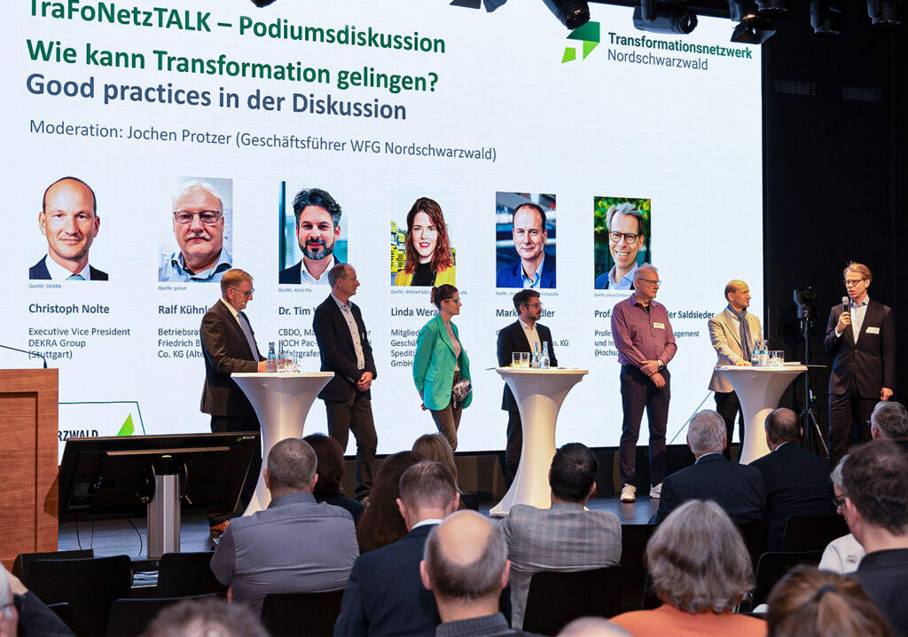 In der Talkrunde „Wie kann Transformation gelingen?“, moderiert von Jochen Protzer, diskutierten Linda Werab (Spedition Eitel, Nagold), Markus Fiedler (FiMAB, Neubulach), Ralf Kühnle (Boysen, Altensteig), Christoph Nolte (Dekra, Stuttgart), Prof. Kai Alexander Salzsieder (Hochschule Pforzheim) und Tim Wolf (Koch Pac-Systeme, Pfalzgrafenweiler). Sie brachten ihre spezifischen Perspektiven und Strategien aus ihrer Unternehmenspraxis ein.