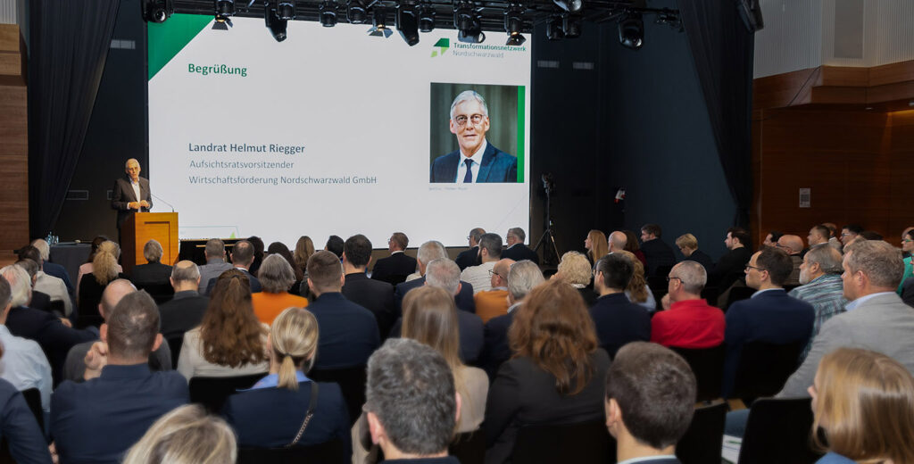 Mit einer pointierten Analyse zur wirtschaftlichen Lage eröffnete Helmut Riegger die Veranstaltung: „Im Nordschwarzwald haben wir doppelt so viele Kurzarbeiter wie im restlichen Baden-Württemberg“, warnte der Landrat des Landkreises Calw und Vorsitzende des Aufsichtsrats der Wirtschaftsförderung Nordschwarzwald (WFG). Die WFG betreut federführend das Projekt TraFoNetz. Die Region könne es sich nicht leisten, 30.000 Arbeitsplätze zu verlieren, so Riegger: „Wir müssen den Wandel mit aller Kraft aktiv gestalten.“