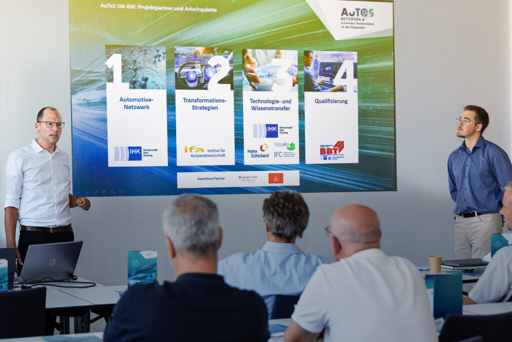 Projektleiter Martin Schmidt (links) und Projektassistent Marc Wasinger stellen Unternehmerinnen und Unternehmer bei der IHK in Villingen-Schwenningen das Modell des AuToS-Netzwerk vor, wie es in ähnlicher Form auch als Transformationsnetzwerk (TraFoNetz) Nordschwarzwald unter Leitung der Wirtschaftsförderung Nordschwarzwald aktiv ist. ©Foto:GerdLache