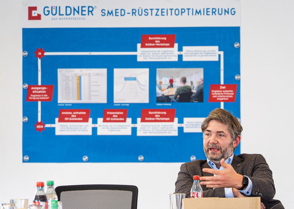 Stephan Loth, Geschäftsführer der G. Walter Güldner GmbH, Remchingen, und Gastgeber des CoP-Formats, stellte in der Vorstellung des technischen Großhändlers das Motto „Mehrwerkzeug“ in den Fokus. Soll heißen: „Wir helfen unseren Kunden, die richtigen Entscheidungen für eine höhere Effizienz zu treffen und schaffen ihnen damit einen echten Mehrwert. Mit dem Wissen der beratenden Güldner-Mitarbeitenden könnten die Kunden Einsparungen im Fertigungsprozess erzielen, und zwar nicht allein durch Einsparungen beim Werkzeug.