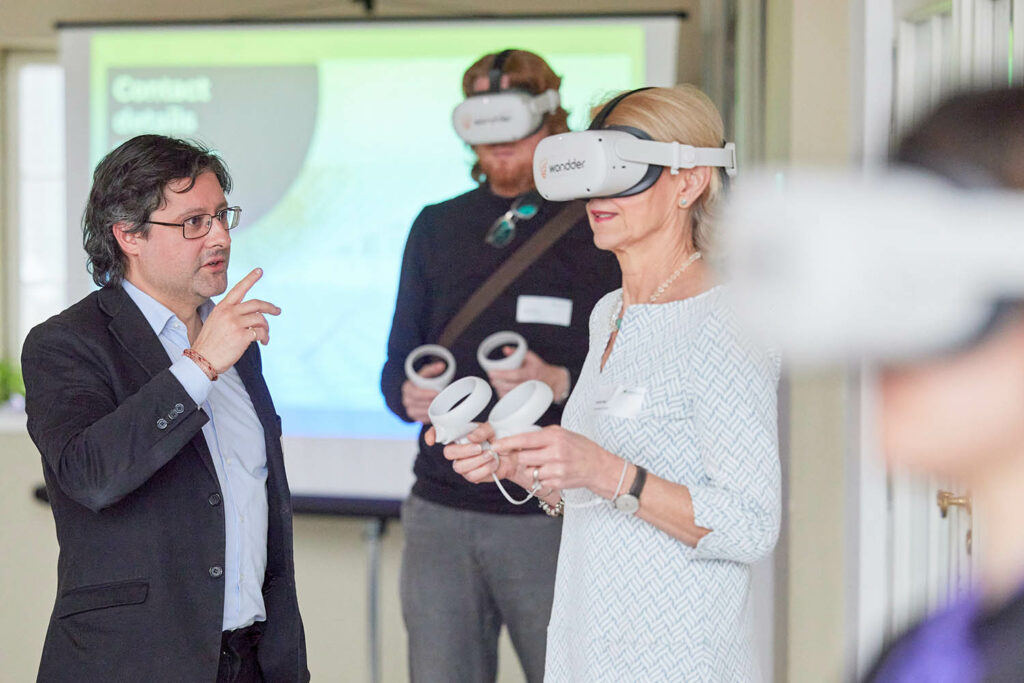 Nach einer kurzen Kaffeepause, die die Teilnehmer rege zum Austausch und Netzwerken nutzten, gab es Einblicke in die Möglichkeiten zur konkreten Förderung von Soft Skills im beruflichen Umfeld. Mihai Streza, Gründer und CEO von Wondder, ließ die Teilnehmer Virtual Reality Brillen aufsetzen. In der virtuellen Welt stießen sie auf computergestützte Avatare, mit denen in vordefinierten Szenarien Gespräche geführt werden können. Dieses Training zur Förderung der Soft Skills von Mitarbeitern setzt Wondder bereits seit fünf Jahren ein. In über 50 Unternehmen weltweit kam das Schulungsangebot bereits zum Einsatz.