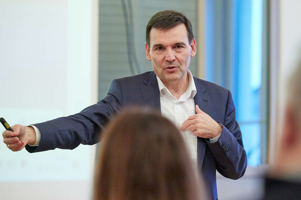 Dr. Martin Krämer, langjähriger HR-Vorstand der SICK AG Waldkirch und geschäftsführender Gesellschafter von I4.0 Network gGmbH, legte den Schwerpunkt seines Workshops auf neue Formen der Organisation und Zusammenarbeit. „Wir haben enorme Ressourcen, wenn wir die Zusammenarbeit in den Unternehmen verbessern“, erklärte er und sprach vom Aufbrechen traditioneller Strukturen, um Abteilungsdenken zu vermeiden. Die Teilnehmer definierten Faktoren, die zur erfolgreichen Transformation beitragen oder als Hindernisse gesehen werden.